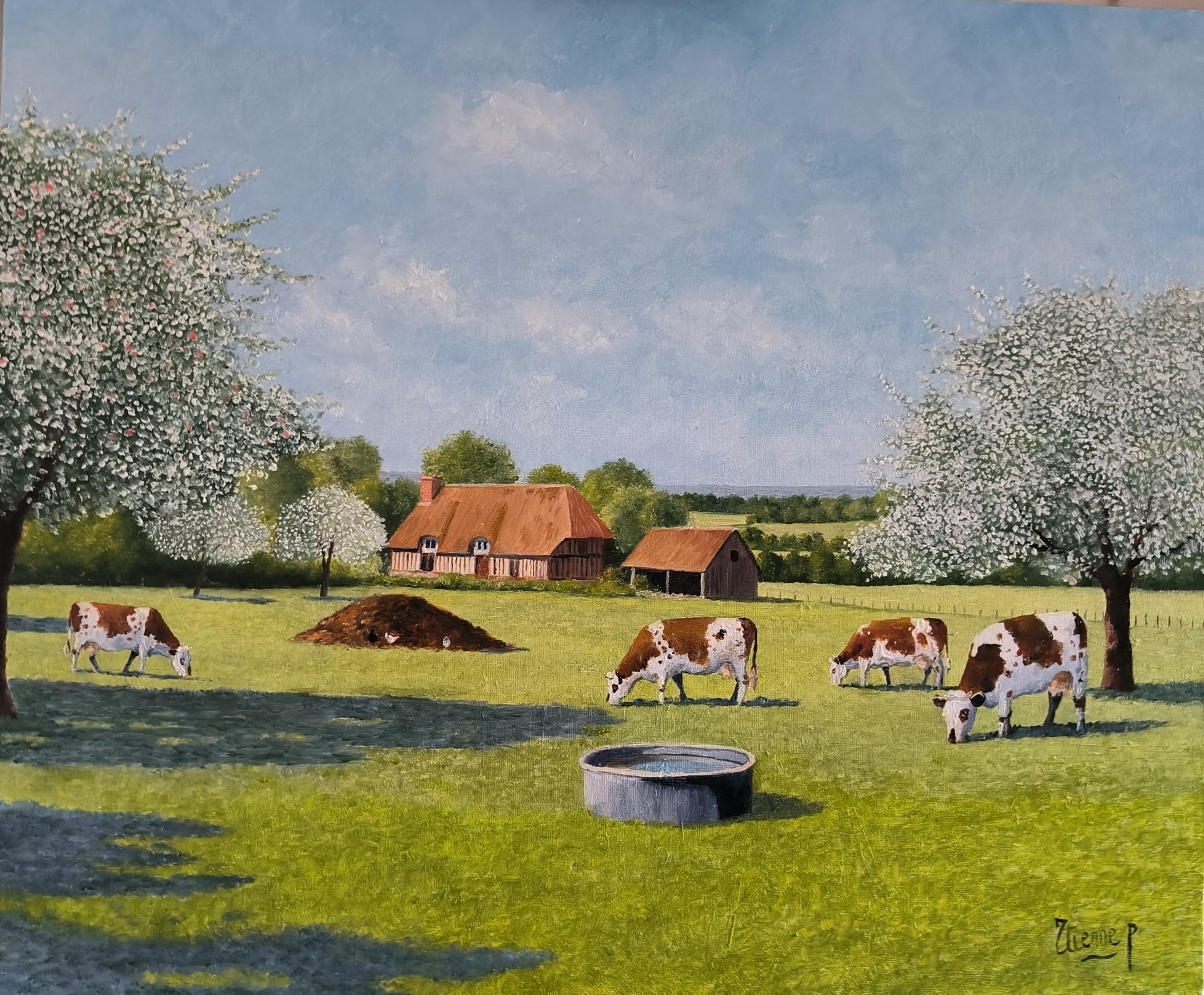 Dans cette toile de Patrick Etienne intitulée Le Chemin, un sentier tranquille serpente à travers la campagne normande, menant doucement vers une chaumière . Des vaches paissent paisiblement dans le pré avoisinant, ajoutant une touche de vie à ce paysage calme. L’ensemble dégage une sensation de douceur et de simplicité, invitant à la promenade et à l’évasion dans la beauté rurale de la Normandie.
