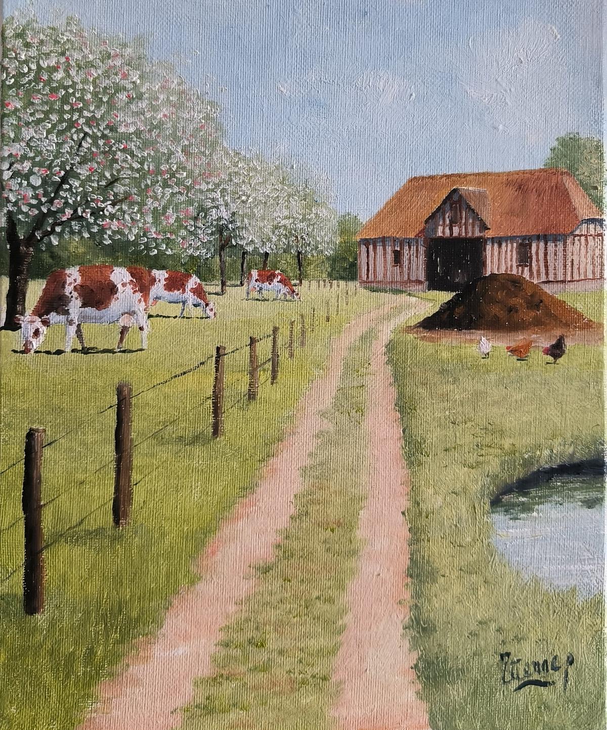 Ce tableau de Patrick Étienne, intitulé "Le Chemin en Normandie", offre une scène paisible et bucolique typique de la campagne normande. On y découvre un chemin de terre bordé d’arbres en fleurs, des vaches paisiblement en train de paître, ainsi qu’une ferme traditionnelle à colombages. L’œuvre capture avec douceur et réalisme la sérénité et la beauté simple de la vie rurale en Normandie.