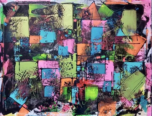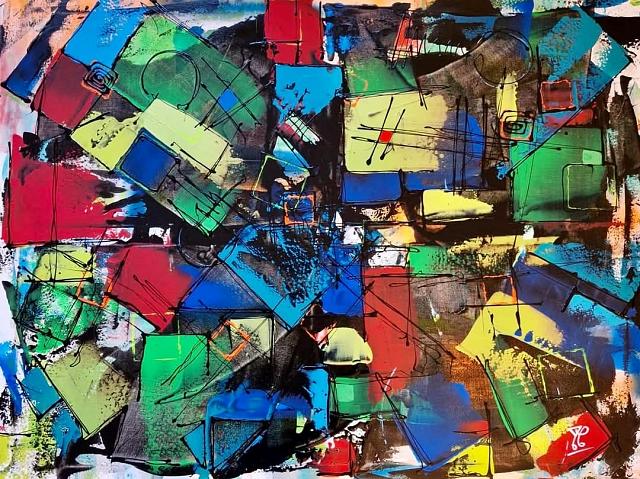 Fragments de couleurs en suspension, toile sur châssis 116 x 89cm 850€