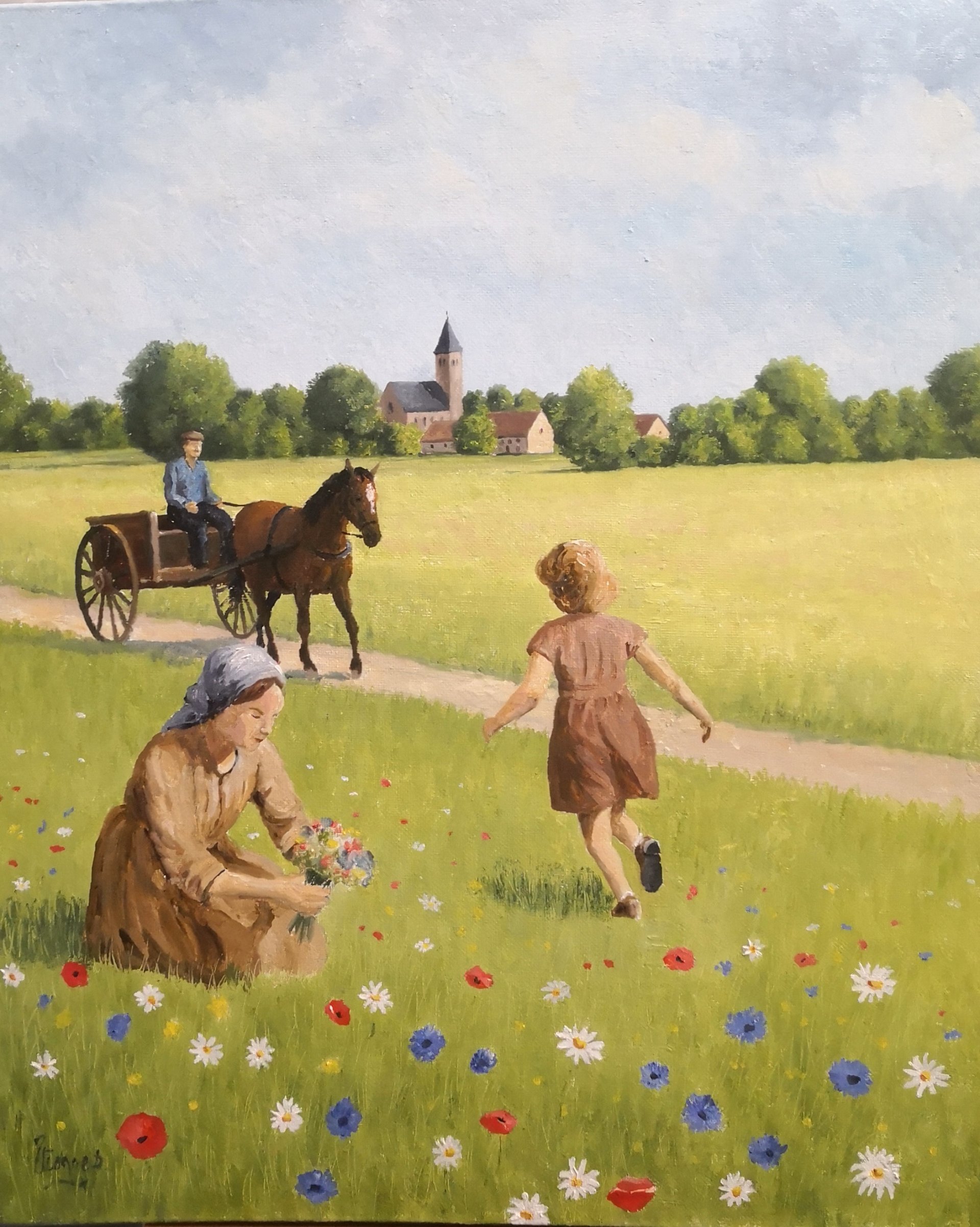 La toile de Patrick Etienne capture une scène bucolique pleine de vie et de poésie. Une enfant court joyeusement au devant une carriole, symbole de liberté et de légèreté. À ses côtés, une femme accroupie dans un champ fleuri, absorbée dans la cueillette des fleurs, rappelant la simplicité et l’harmonie de la nature. En arrière-plan, un village pittoresque se dessine, avec son clocher pointant vers le ciel, ajoutant une touche de tranquillité et de sérénité à cette composition riche en couleurs et en émotions. Un tableau qui invite à la rêverie et à l’évasion.
