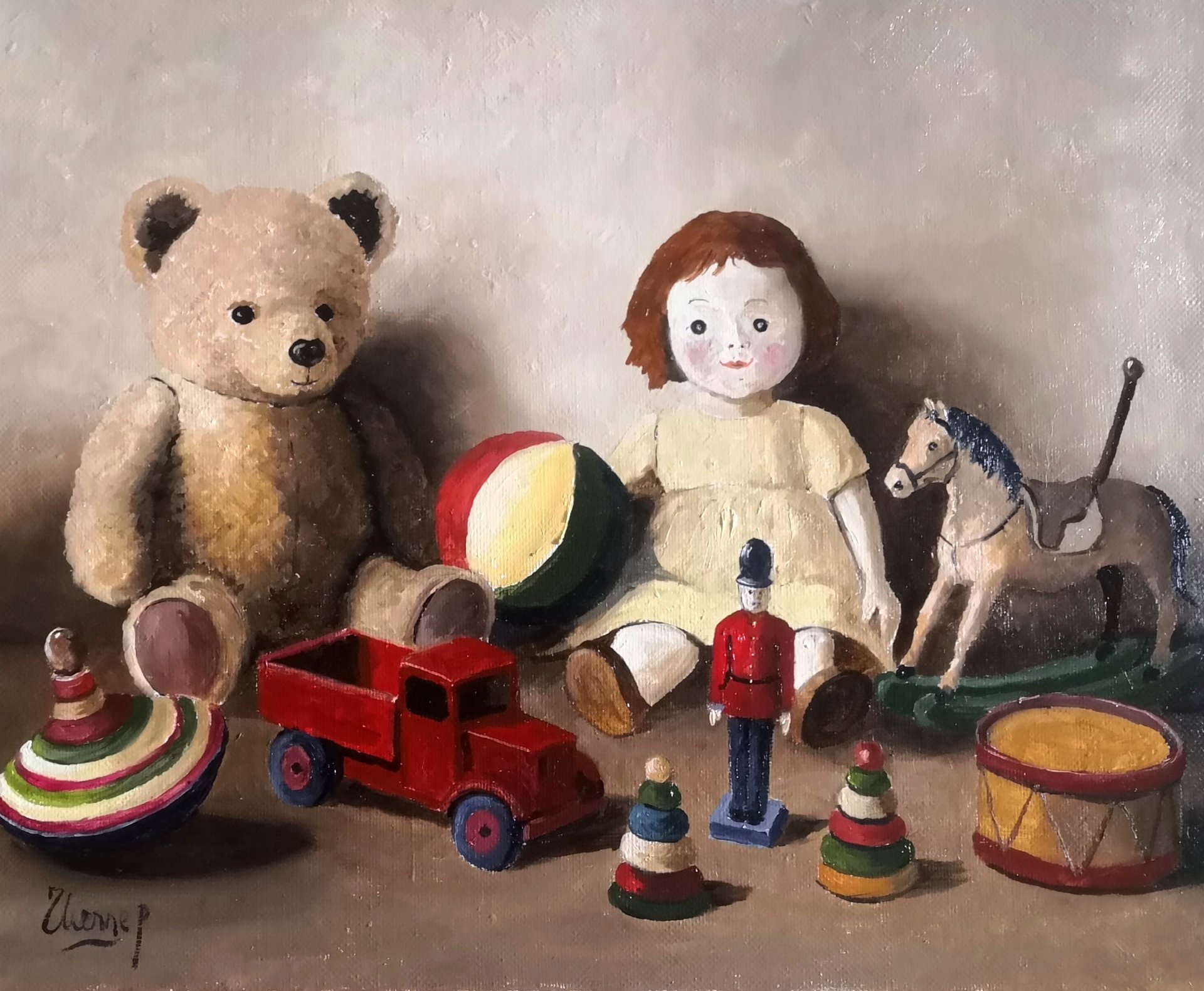 Le tableau Les Vieux Jouets de Patrick Etienne invite à une plongée dans l’univers nostalgique de l’enfance, à travers des objets à la fois simples et évocateurs. Sur la toile, des jouets d’autrefois – un nounours usé, une poupée de chiffon aux traits effacés, un tambour et une toupie – sont magnifiquement mis en scène. Ces objets, empreints de tendresse et de mémoire, semblent porteurs d’histoires oubliées, témoignant de moments de jeu, de rires et de découvertes. À travers cette composition, Etienne explore le passage du temps et l’attachement émotionnel que nous portons à ces vestiges de l’enfance. Chaque jouet, dans sa simplicité, invite à la réflexion sur la fragilité et l’éphémère de nos souvenirs les plus chers.