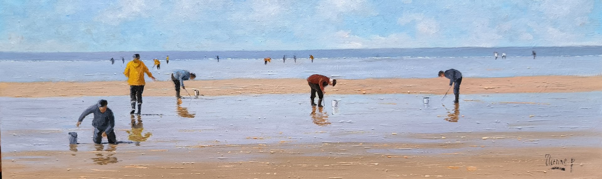 Le tableau Marée Basse de Patrick Etienne capture l’instant suspendu où la mer, reculant loin à l’horizon, laisse apparaître une vaste plage de sable. Sous un ciel ensoleillé, des pêcheurs à pied s’activent sur cette étendue, leur silhouette marquée par la lumière. La scène dégage une tranquillité rustique, où la nature et l’homme coexistent dans un moment paisible de la vie quotidienne.