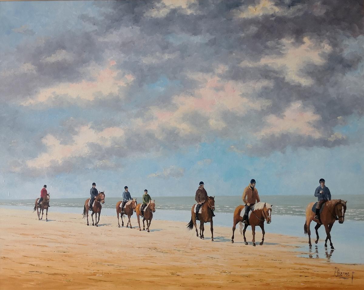 Le tableau Sur la Plage de Patrick Etienne saisit un instant de tranquillité où sept cavaliers se promènent le long du rivage. Le ciel, chargé de nuages mais encore baigné de lumière, crée une atmosphère à la fois calme et impressionnante. Les vagues viennent doucement lécher le sable, apportant une sensation de sérénité et de liberté, où l’homme et la nature se retrouvent en parfaite harmonie.